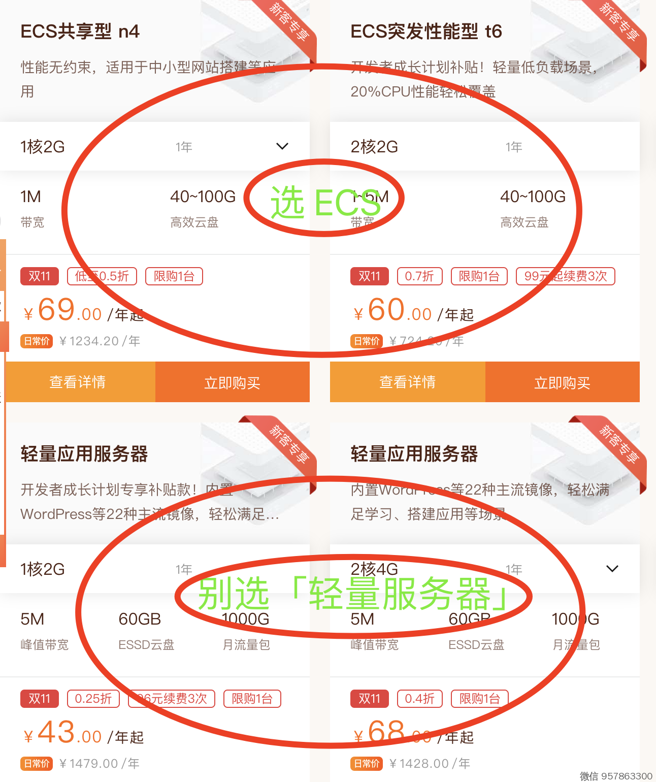 1、选 ECS即可(RDS、OSS别买,个人学习的服务器,没用处 -> 自己ECS安装一个mysql即可 )