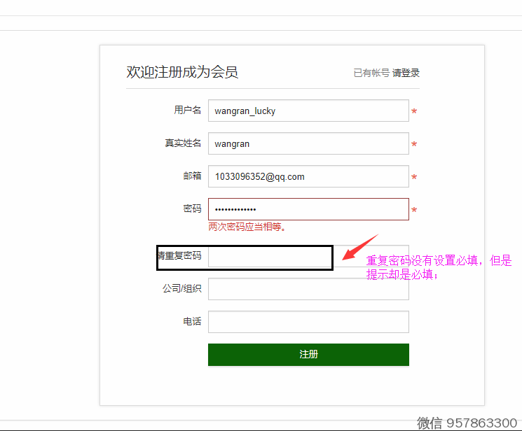 新用户进行注册操作,填写用户信息 ,确认密码没有设置为必填项,点击“提交操作”,验证却提示“请重复密码”为必填项;